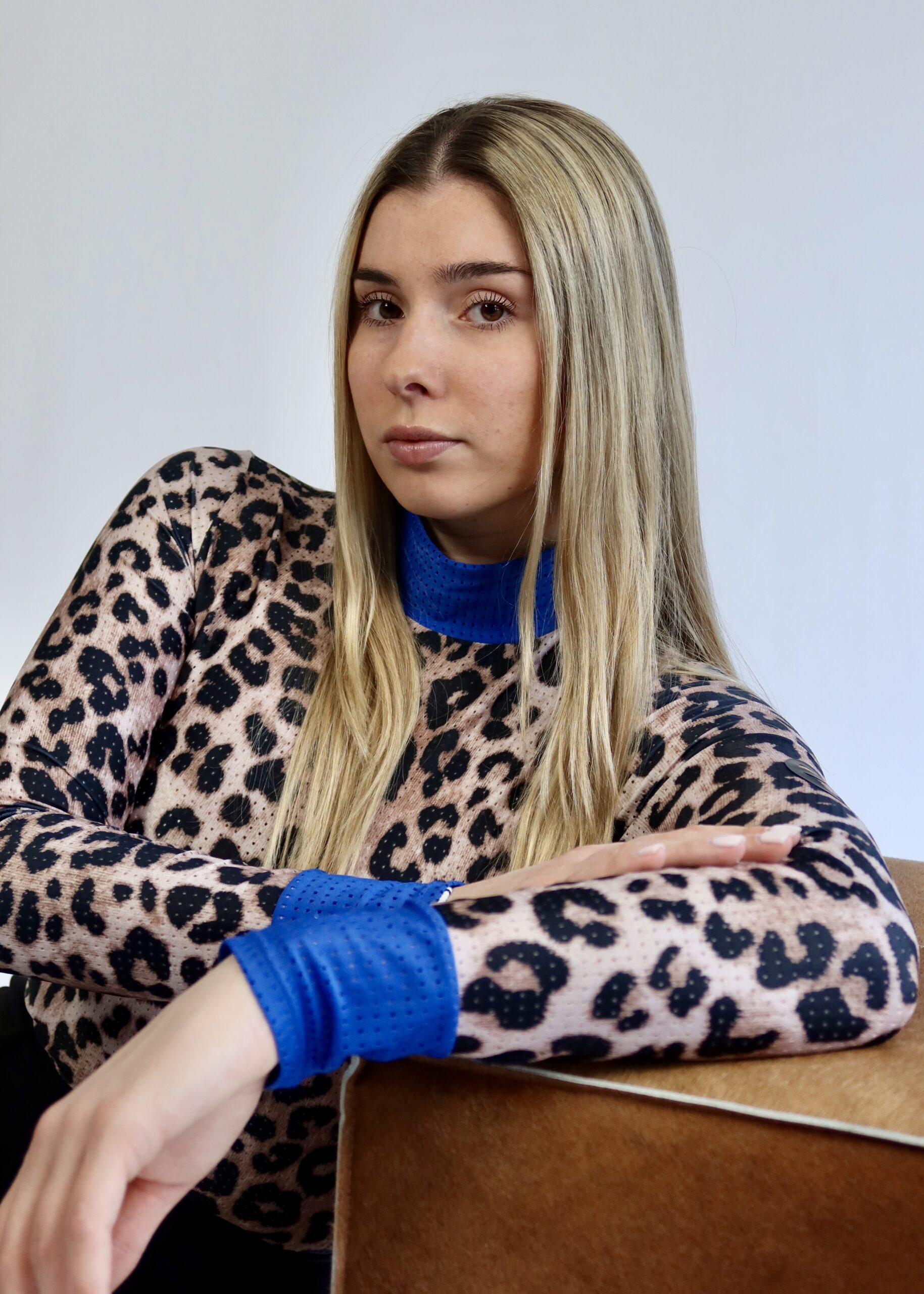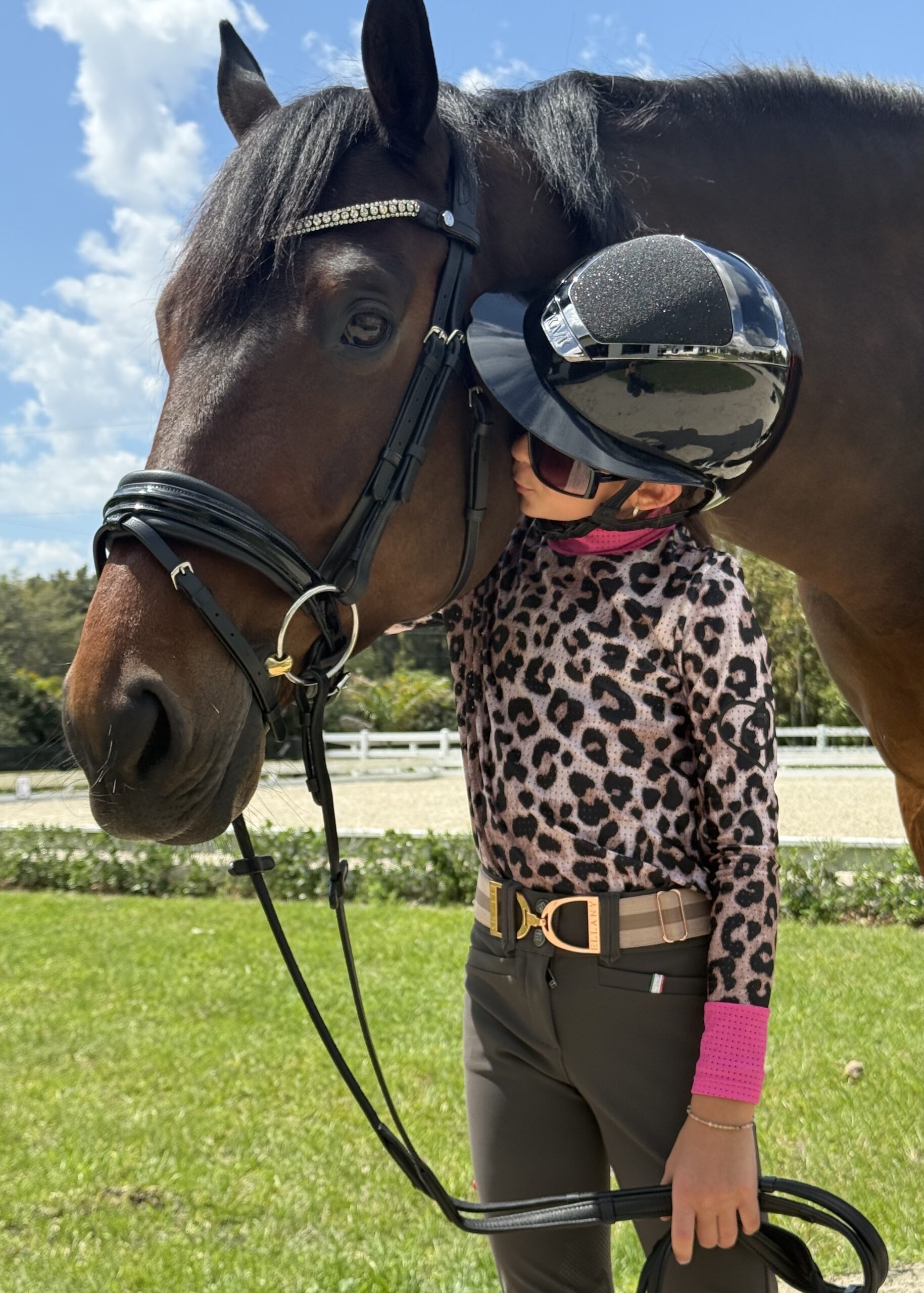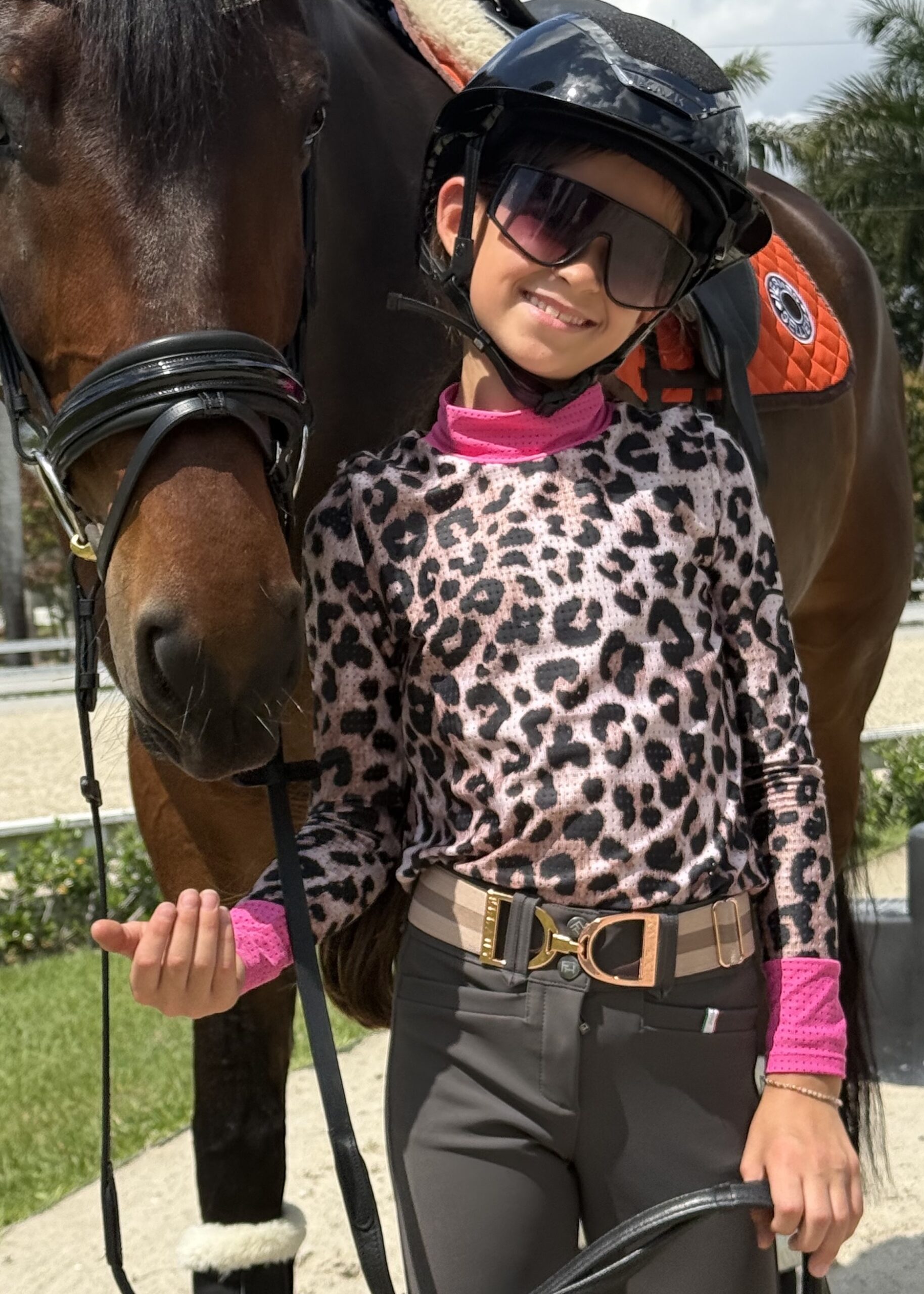Our LIL’ZARA perforated mockneq for youth riders features stylish cheetah print with breathable performance fabric. Designed for comfort and movement, it’s finished with bright, colorful collar and cuffs that add a fun pop of personality—perfect for riding lessons, barn days, or casual wear.